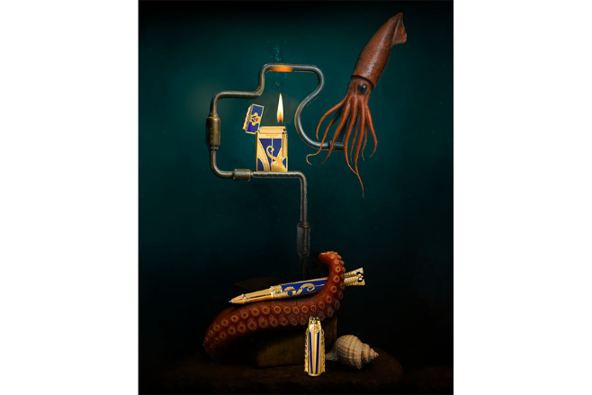 ル・グラン デュポン ライターは、深海を思わせるブルーラッカーに金仕上げの触手モチーフを象嵌。天面には舷窓をイメージした開口デザインが施され、炎の誕生を深海の光に見立てる。黄炎と青炎を切り替えられるデュアルイグニッションシステムは、技術と詩情を融合させた象徴だ。 このセットを手にすることは、物語の一章を自らのものとする歓びであり、深海の冒険へ漕ぎ出す第一歩となる。クラフツマンシップの結晶が、いま、あなたの手で新たな航海を始める。