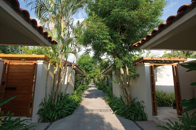 各ヴィラへと通じる表門を開けると最初に目に入る植物と建物の心地よさ。