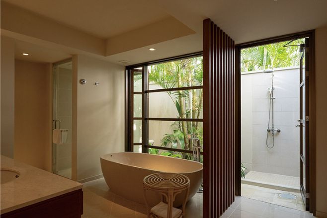 リビングやベッド、バスルームを使う際の家具の配置、プールから上がったときの動線と光や風を感じる空間の抜け感。