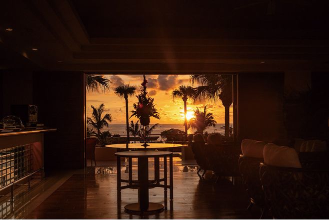 車寄せに到着し、車外へ出ると鮮やかで明瞭な海の香りが身を包み、目の前にはレセプションデスクを抜けて一直線に海、そして水平線へと繋がる景色が広がる。