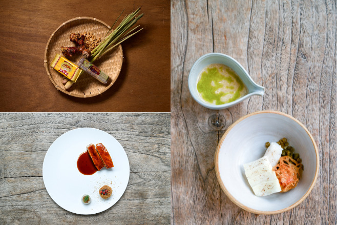 現在のメニューはコースのみであり、「辦桌(パントッ)」と呼ばれる台湾の伝統的な宴会料理をベースに設定。コースの品目にそれぞれの民族の食材や調味料を取り入れ、全体を味わうことで台湾の食文化を体験することができる。左上写真は台湾南部から仕入れた、アマニを食べて育った豚のロースを2週間熟成させた炭火焼き。ソースは豚骨出汁に米を主原料とするウイスキーを加えている。一方、右上写真は台湾の湖や川をイメージしたスープ。蛤で出汁をとり、具材にはマコモとカエルのミートボール。そして写真右下はズッキーニの花の天ぷら。下に敷いたのは自家製豆腐。奥の四角い乾燥湯葉を砕いて振りかけて食す。まさに台湾を味で旅する思いに溢れる。