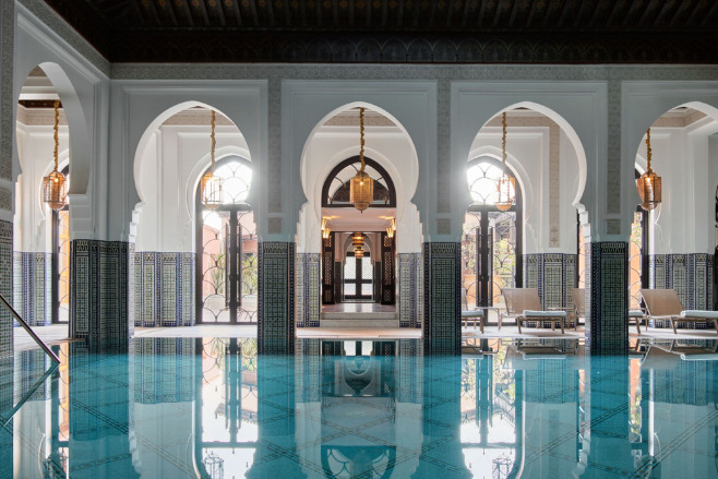 客室も豪奢なタイル張りや緻密な配色と造形美。まるで映画か美術品の中にいるような感覚にすらなる。2023年におこなわれた大改修により100年続いた歴史と現在のラグジュアリーが複雑に絡み合い、体現している姿は見事の一言。アフリカならではの大胆さとモロッコならではの洗練された様式美は目を見張るものがある。